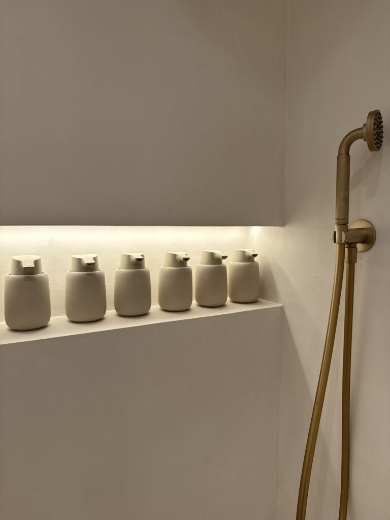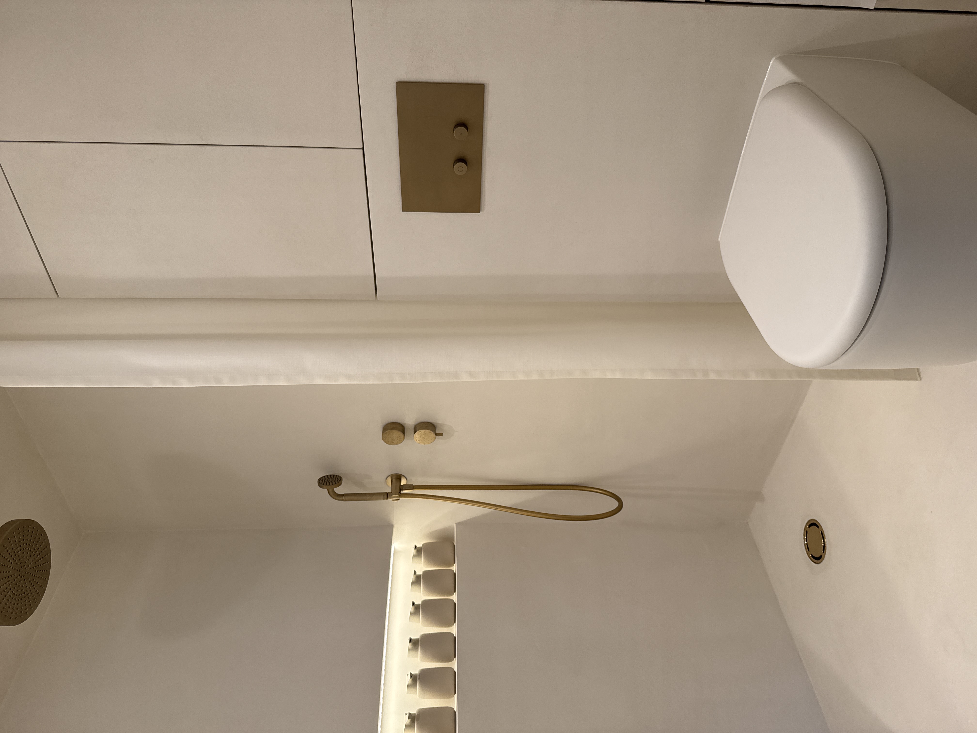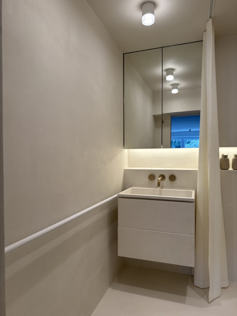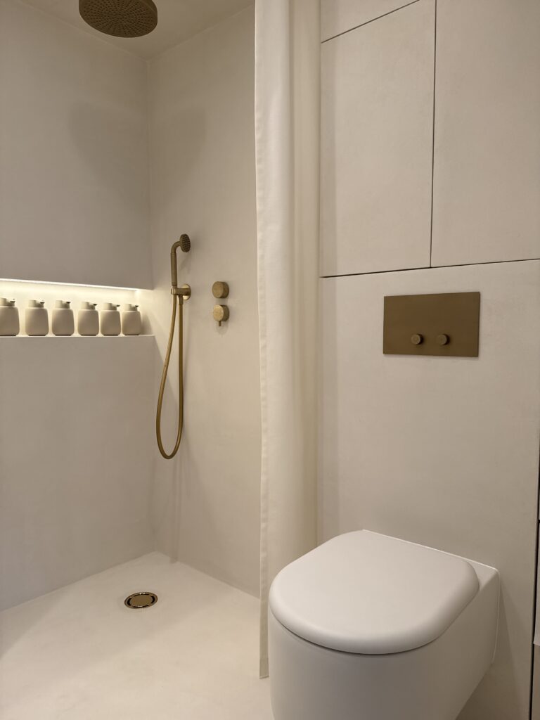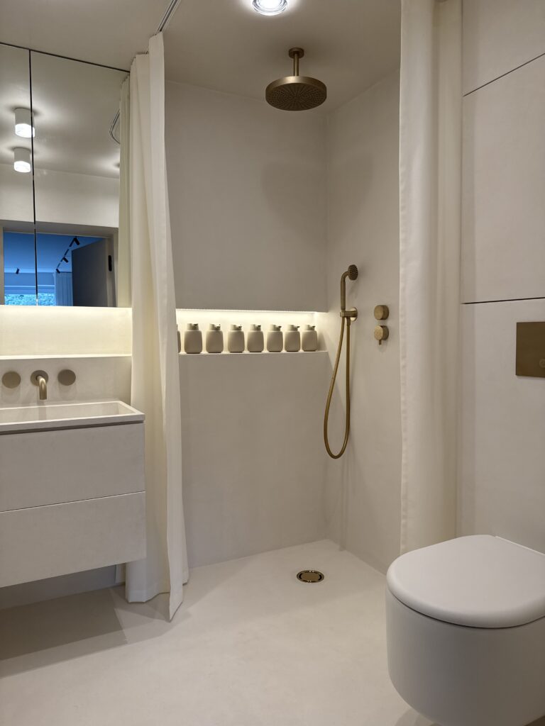 A recessed shelf with subtle backlighting provides both practicality and atmosphere, while the microcement shower area flows continuously into the floor for a clean, watertight finish. Brass fixtures add warmth and contrast against the neutral tones, balancing elegance with modern simplicity. The vanity unit is fully wrapped in microcement, with a bespoke integrated basin for a seamless look.