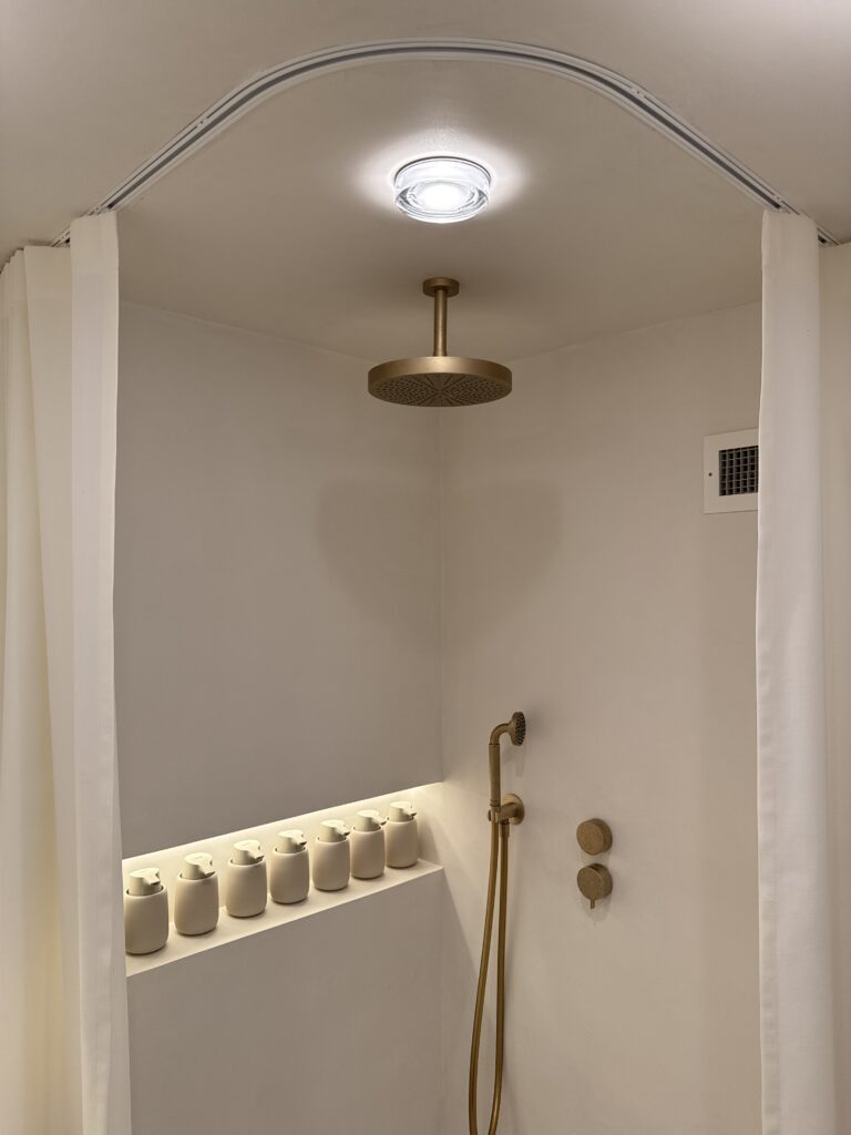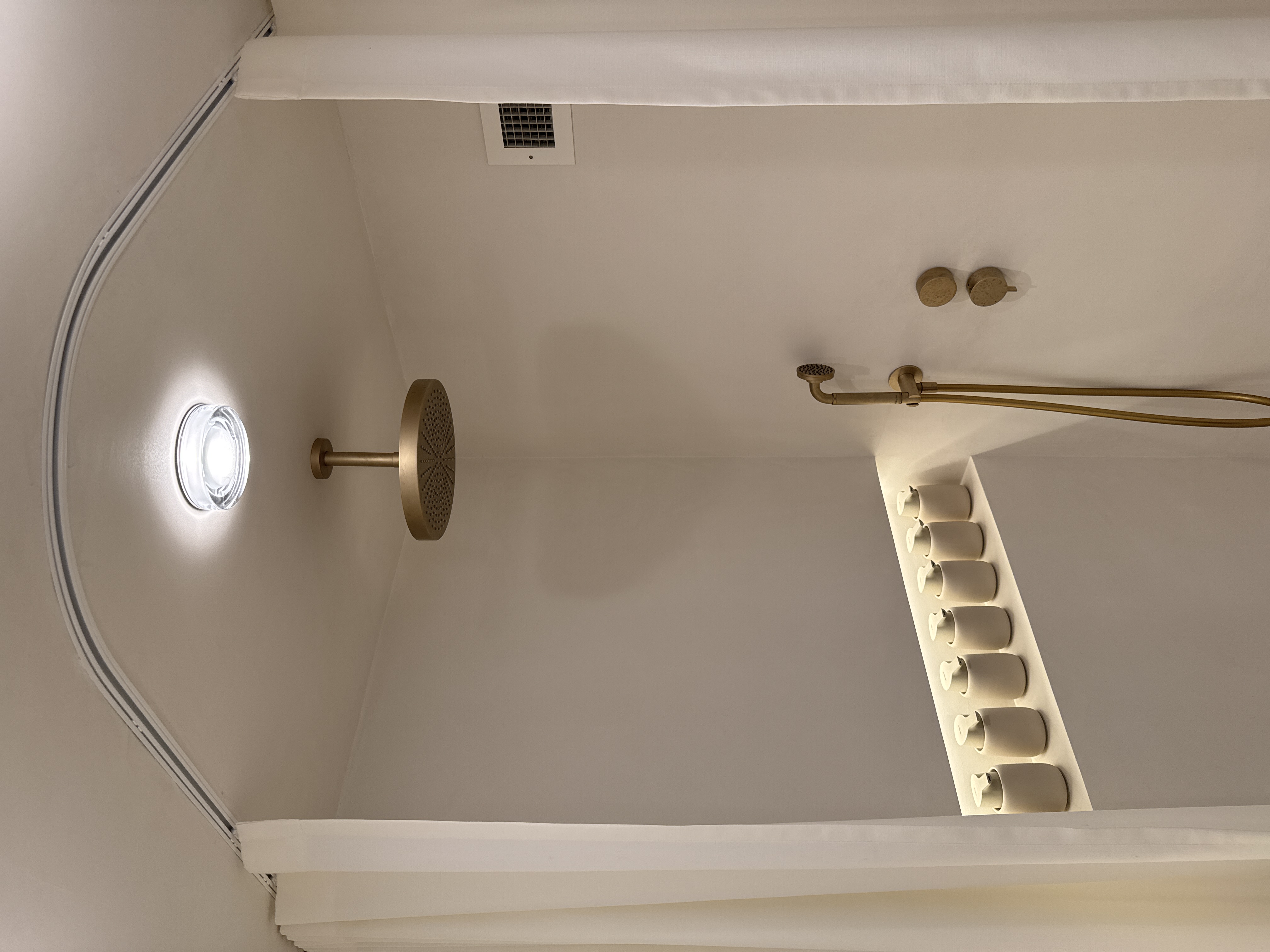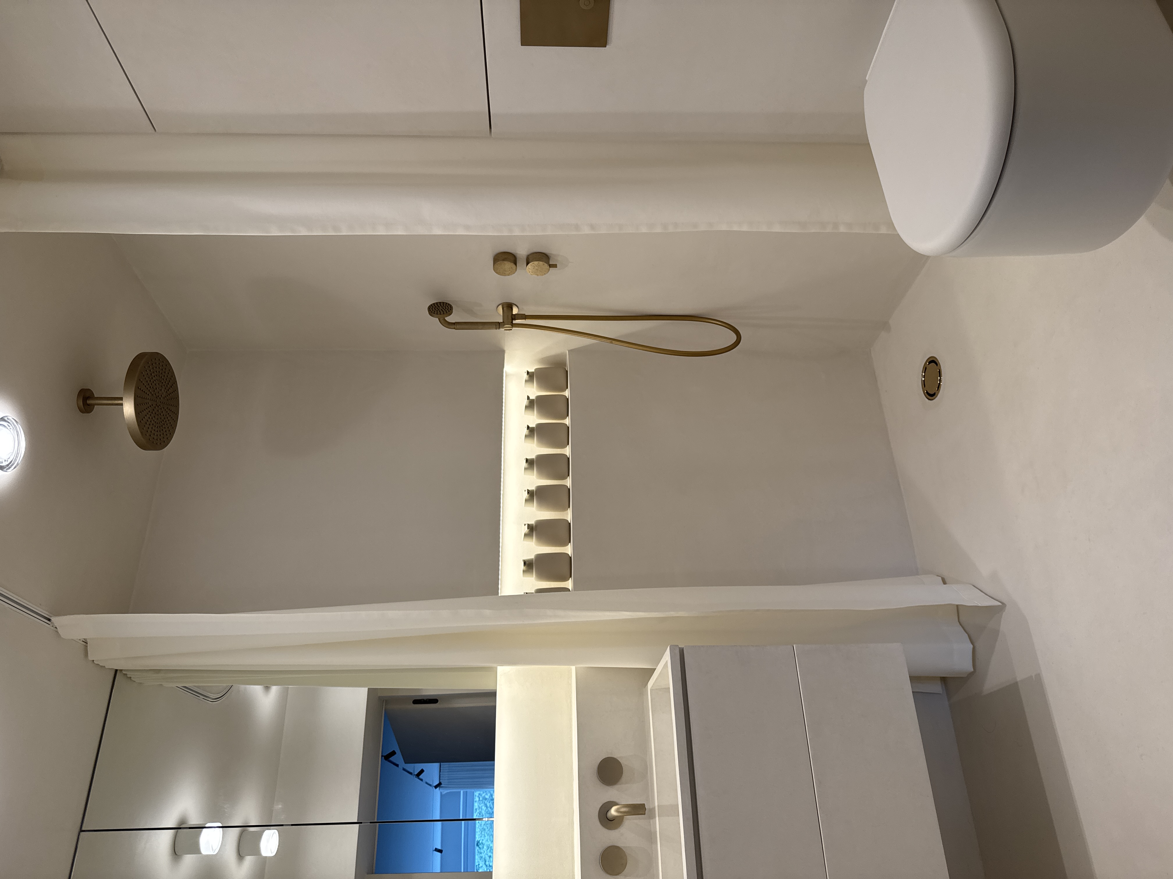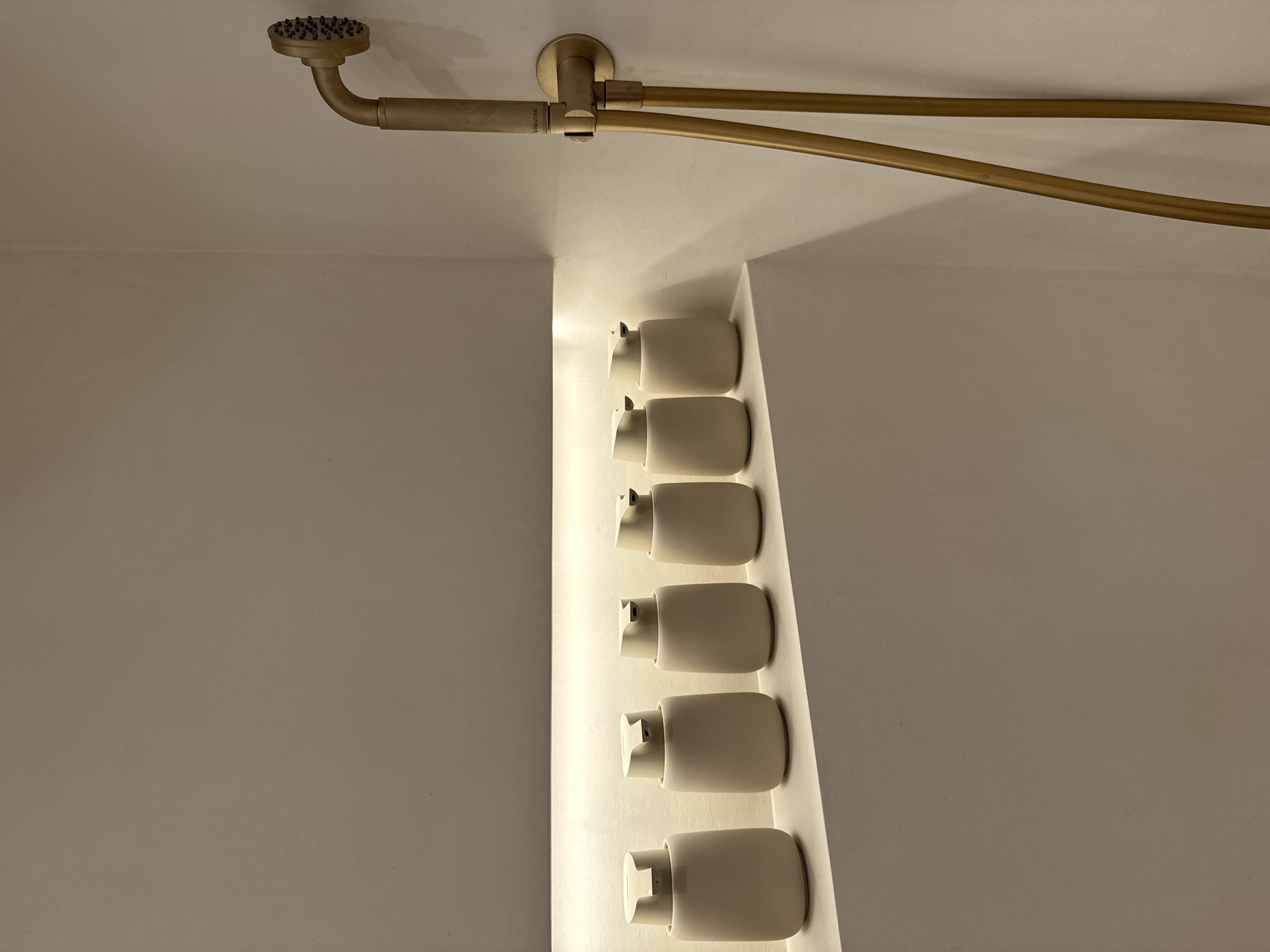 A recessed shelf with subtle backlighting provides both practicality and atmosphere, while the microcement shower area flows continuously into the floor for a clean, watertight finish. Brass fixtures add warmth and contrast against the neutral tones, balancing elegance with modern simplicity. The vanity unit is fully wrapped in microcement, with a bespoke integrated basin for a seamless look.