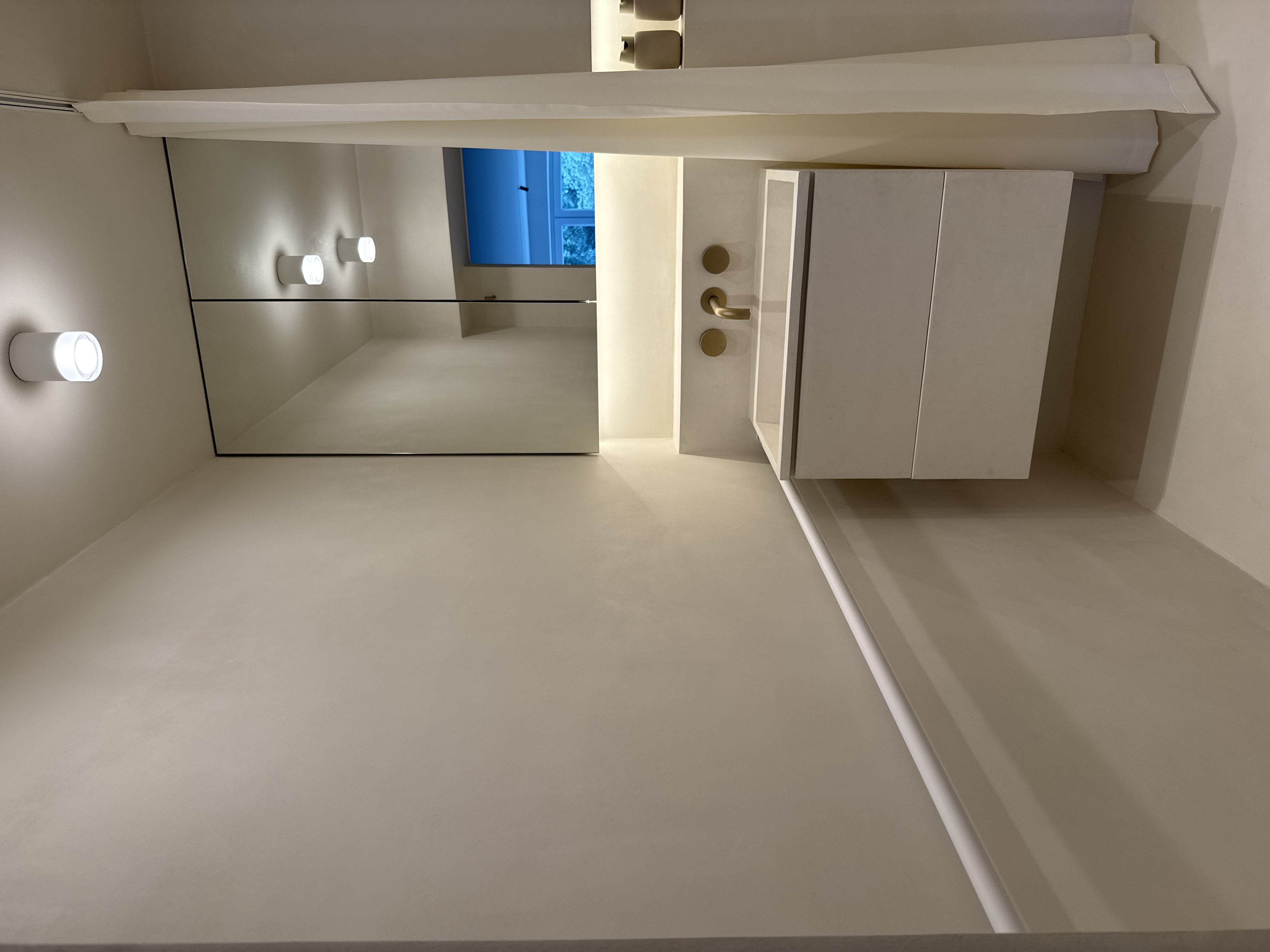 This bathroom is finished entirely in seamless microcement, creating a calm, minimal aesthetic with a soft, natural texture. The light-toned surface enhances the sense of space, while the integrated design elements keep everything refined and functional.