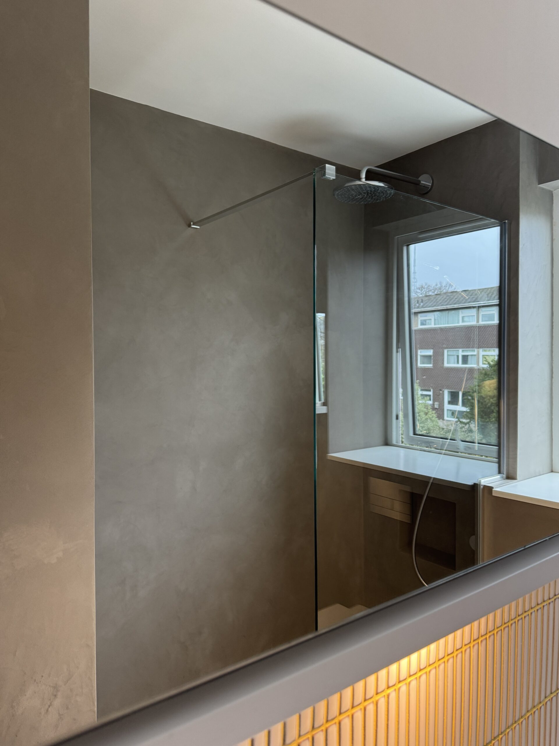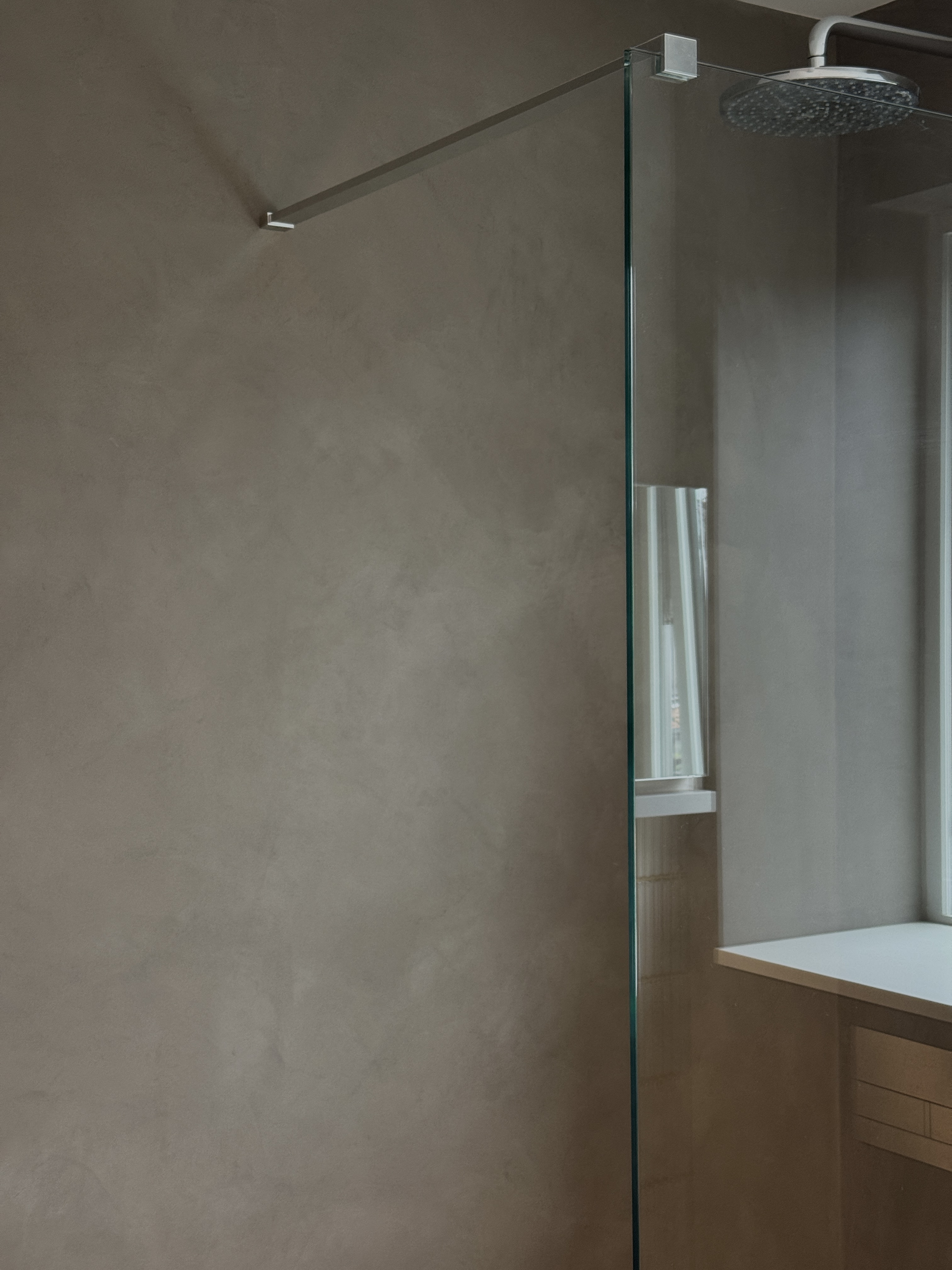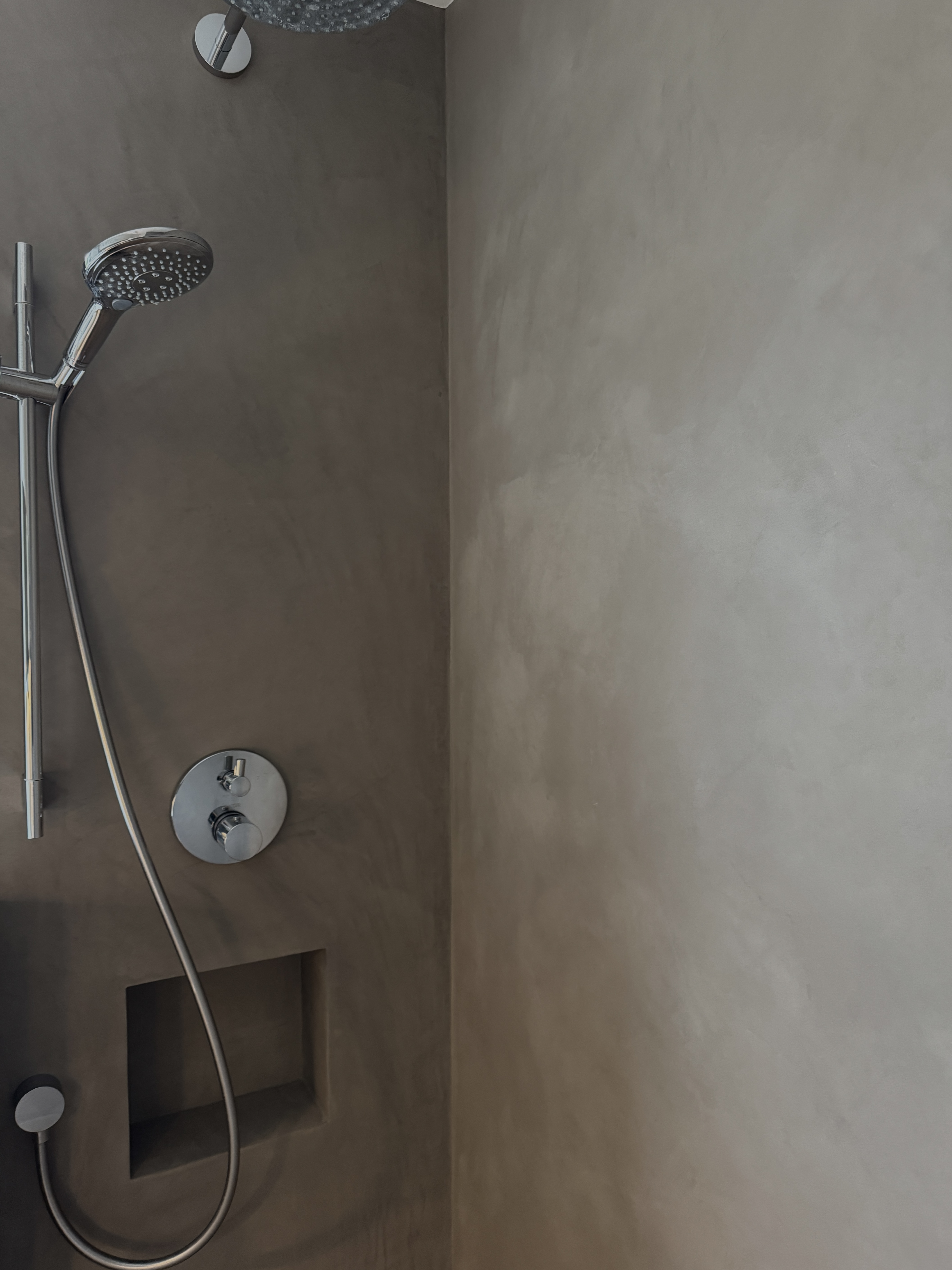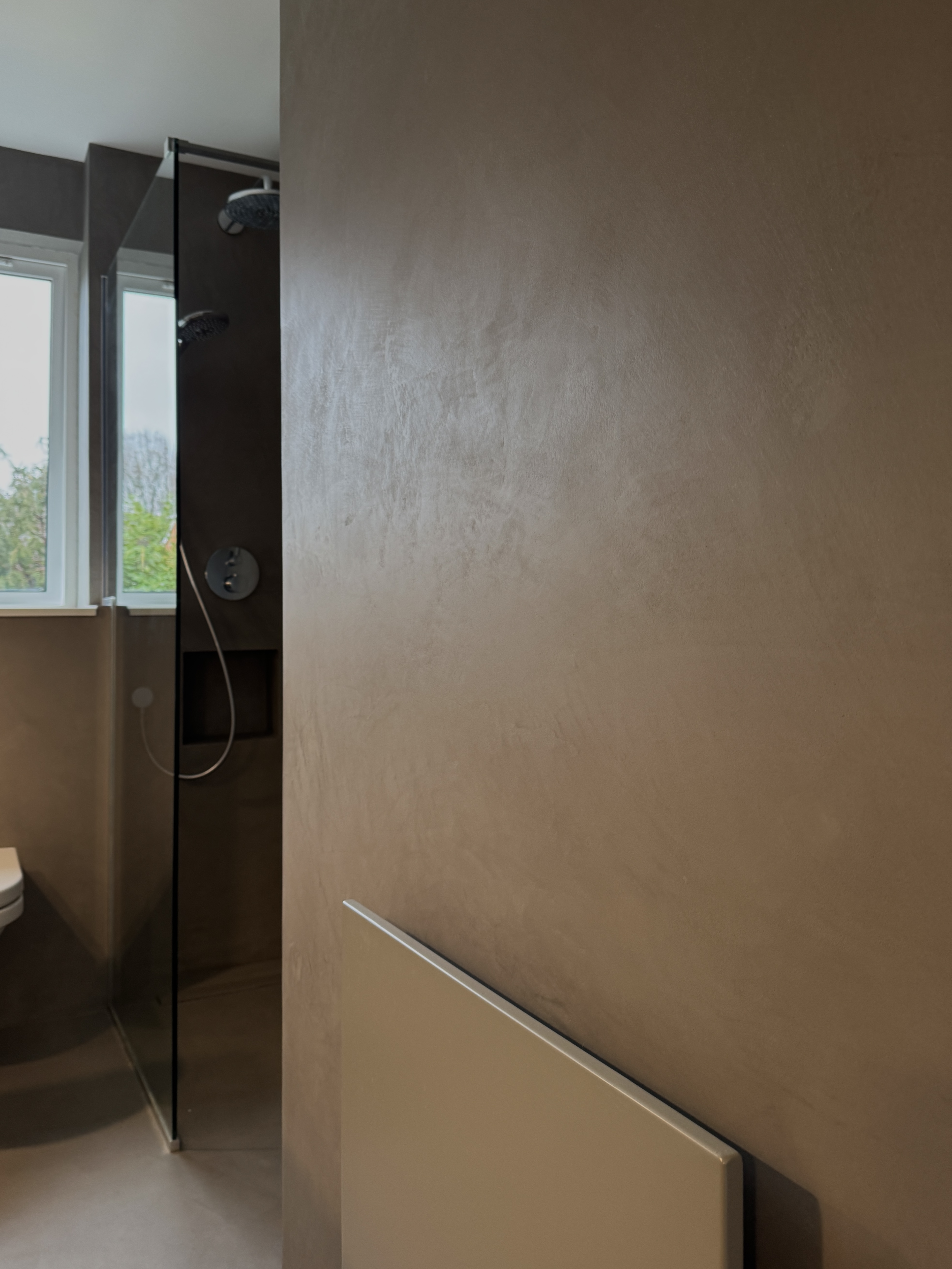 This bathroom is finished entirely in microcement, creating a seamless, contemporary surface with a refined burnished effect. The softly polished finish introduces subtle tonal movement, giving the space depth while maintaining a calm, minimalist aesthetic.