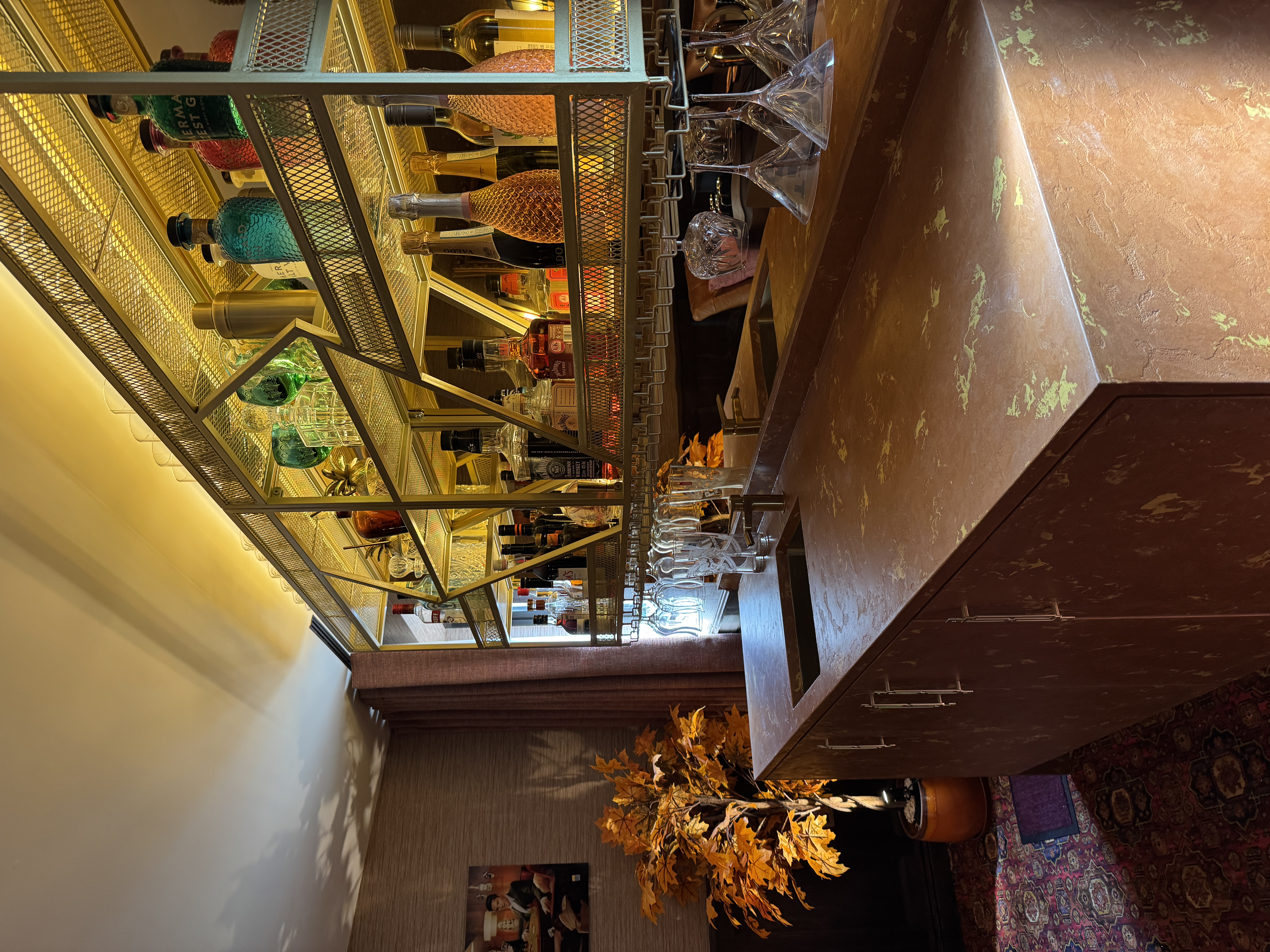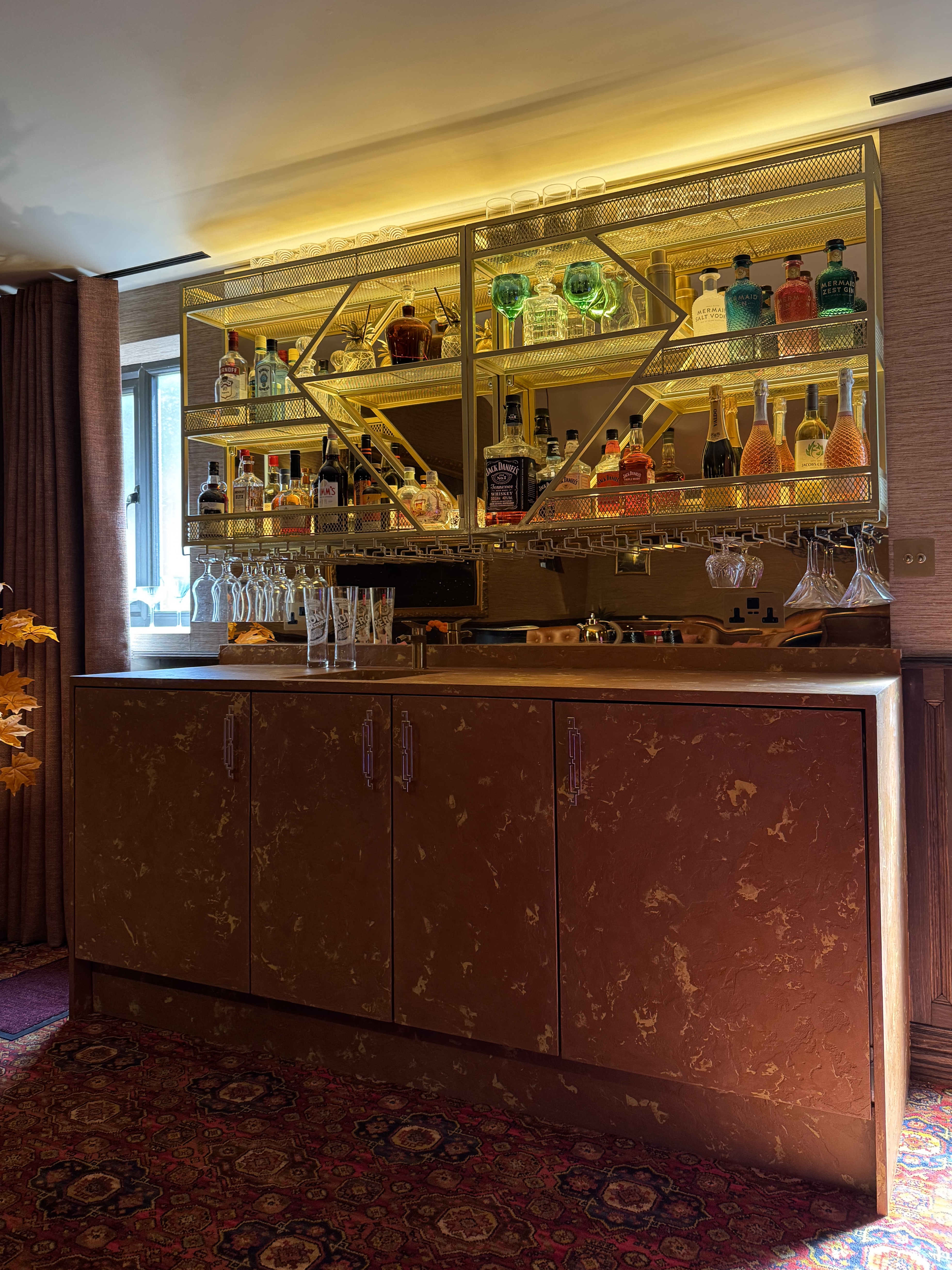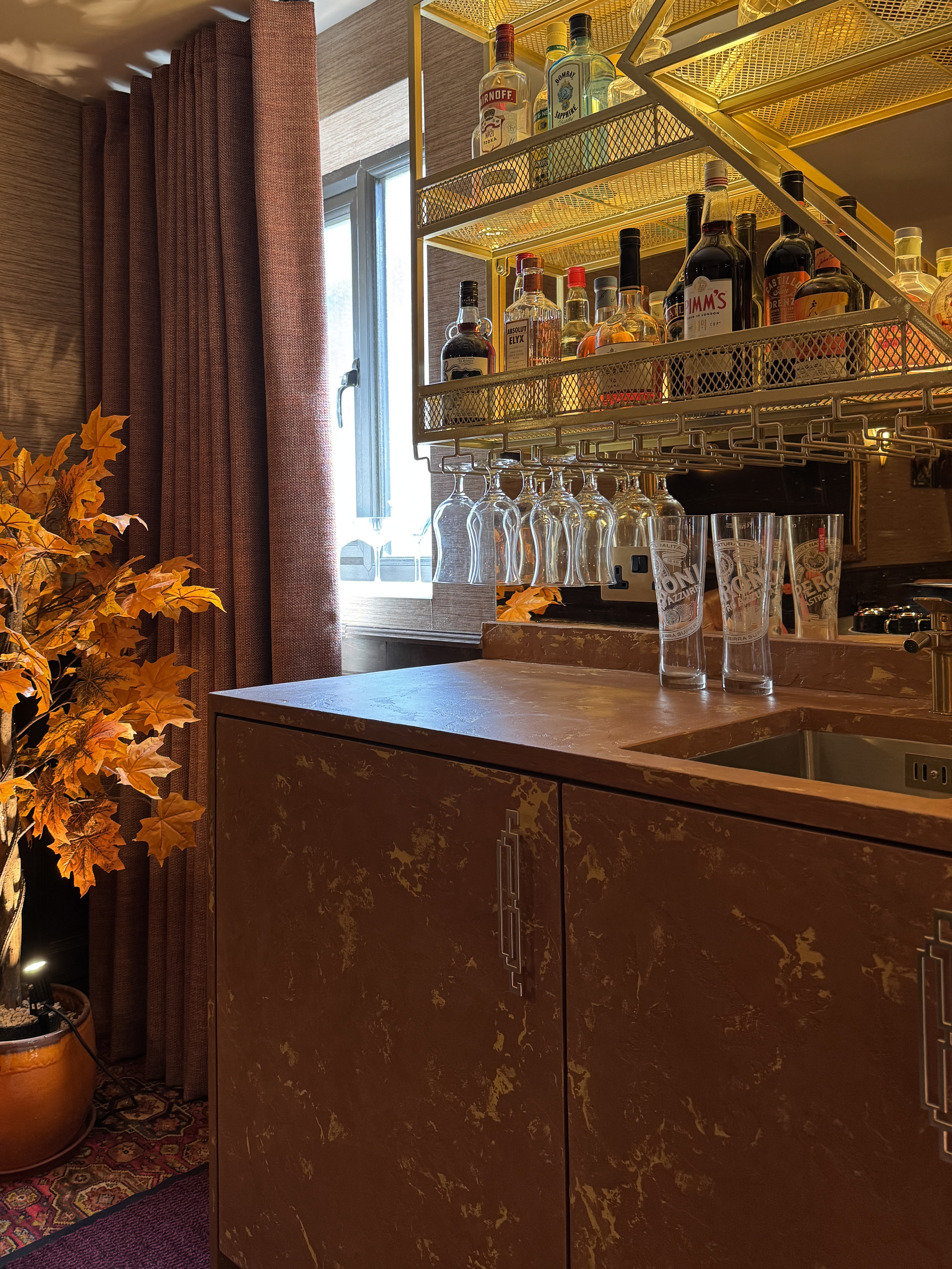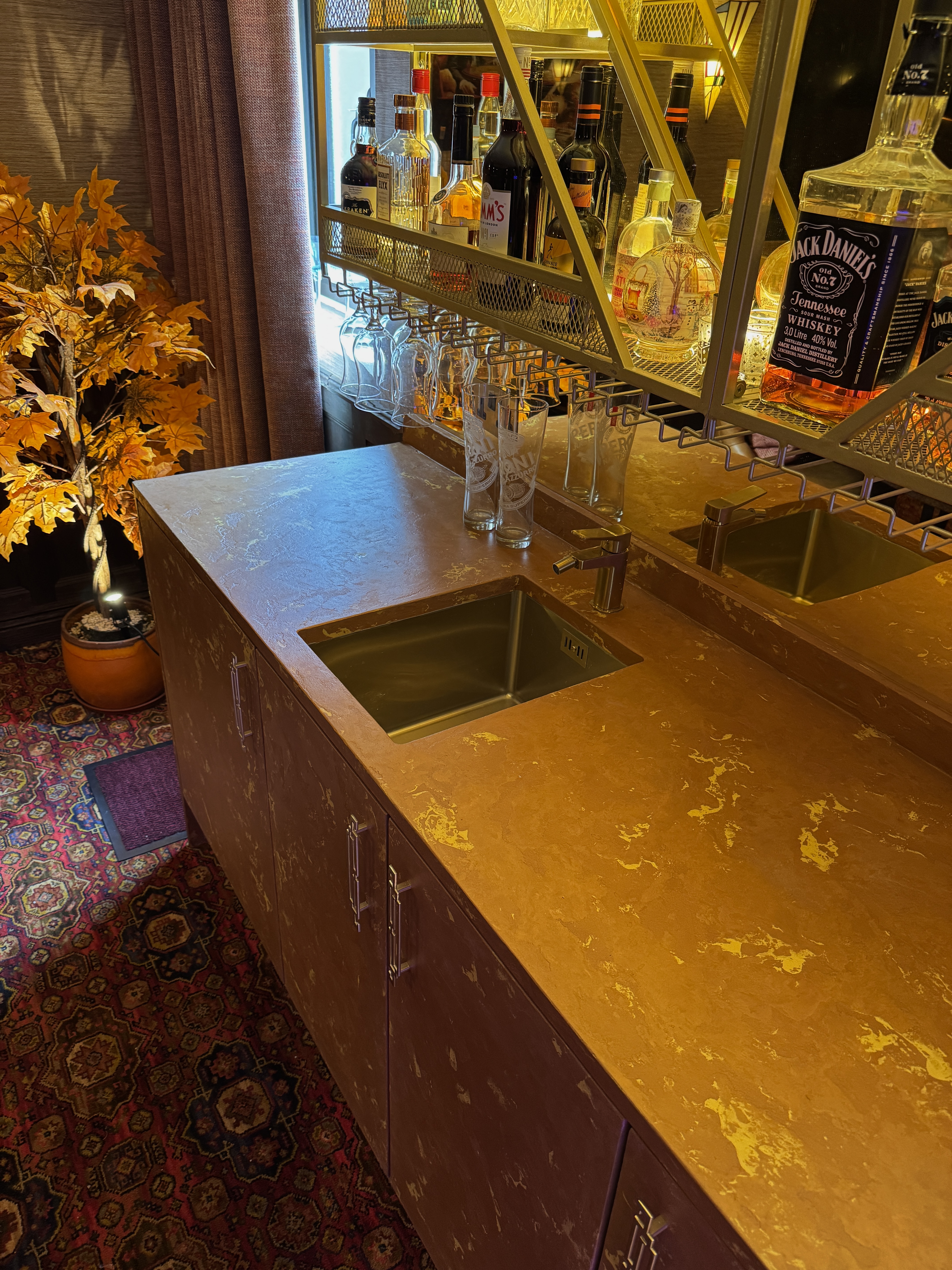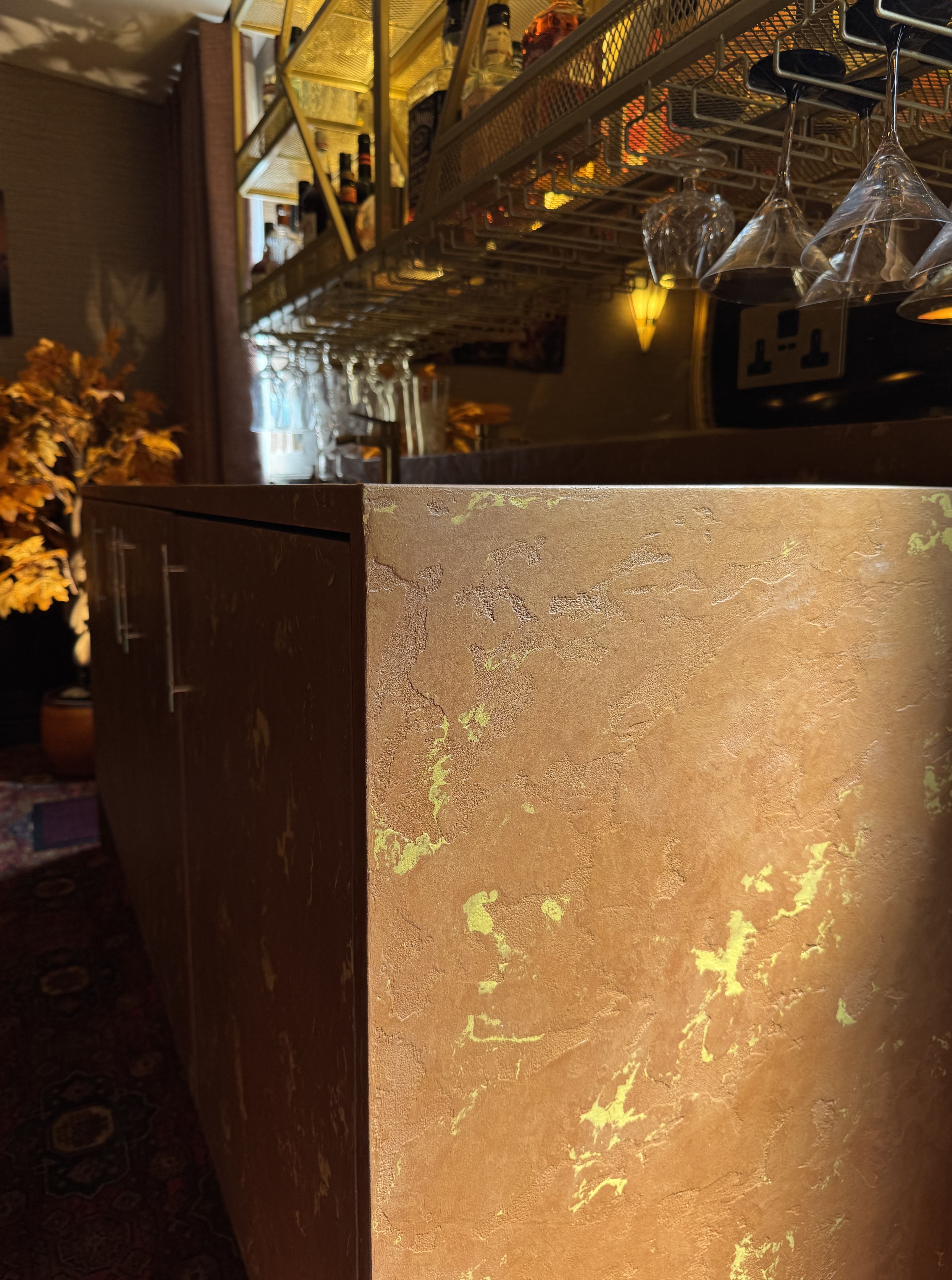 A bespoke microcement finish brings a bold, luxurious touch to this contemporary bar setting. Rich, rust-coloured surfaces with delicate metallic veining add a tactile, organic texture that complements the golden shelving and deep ambient lighting. The custom microcement seamlessly wraps around cabinetry and countertops, anchoring the vibrant glassware display with a grounded, earthy tone.