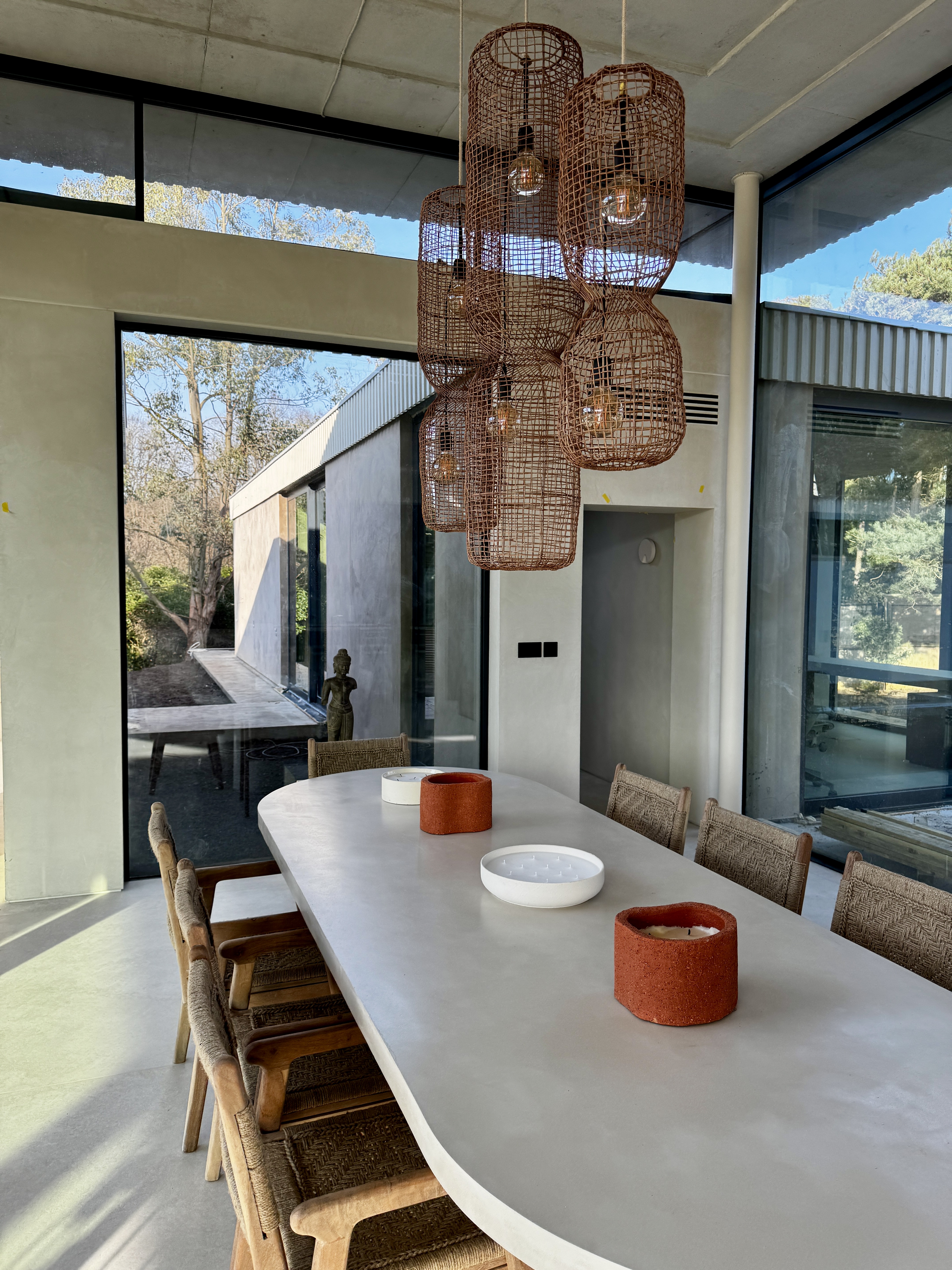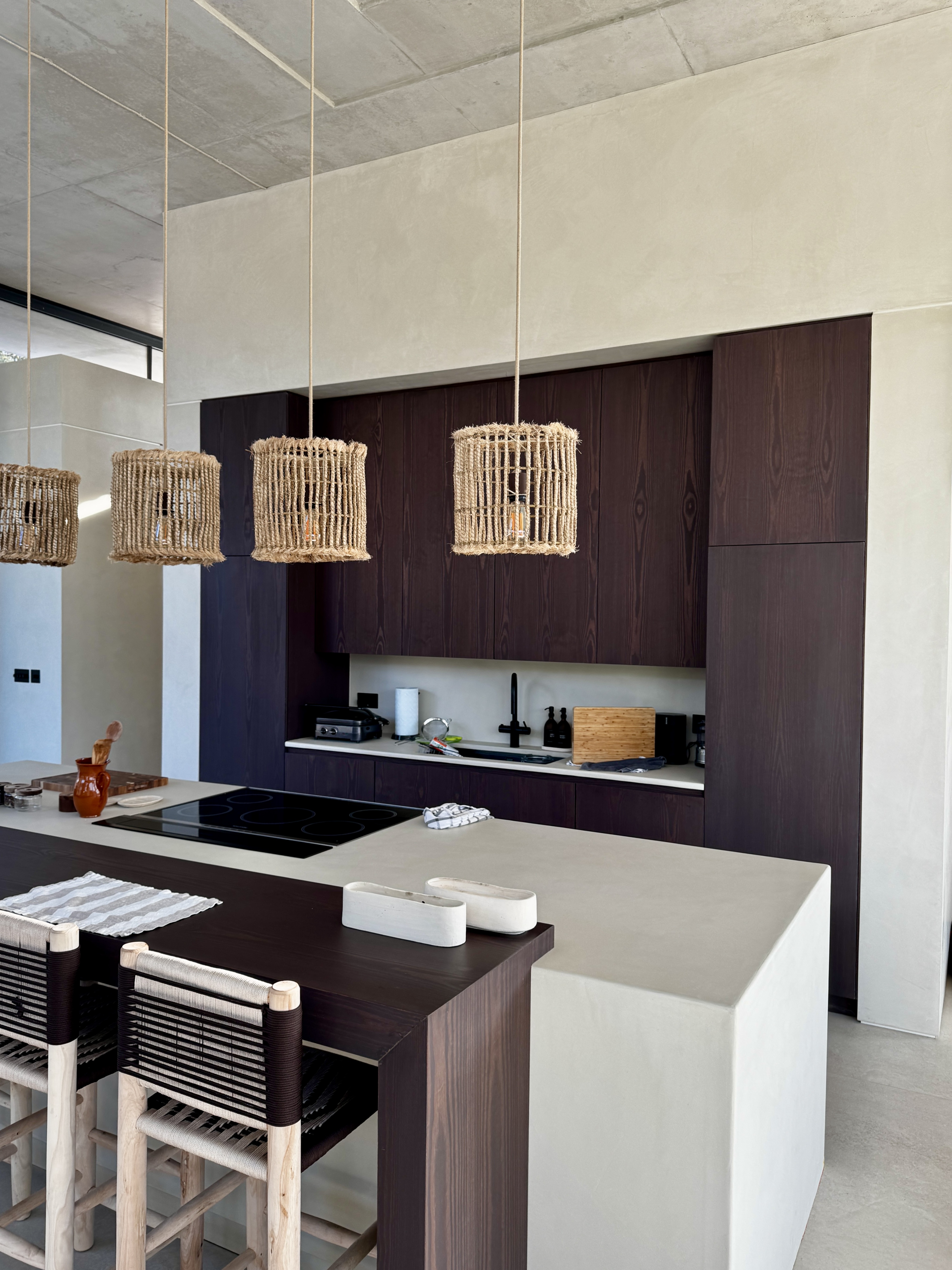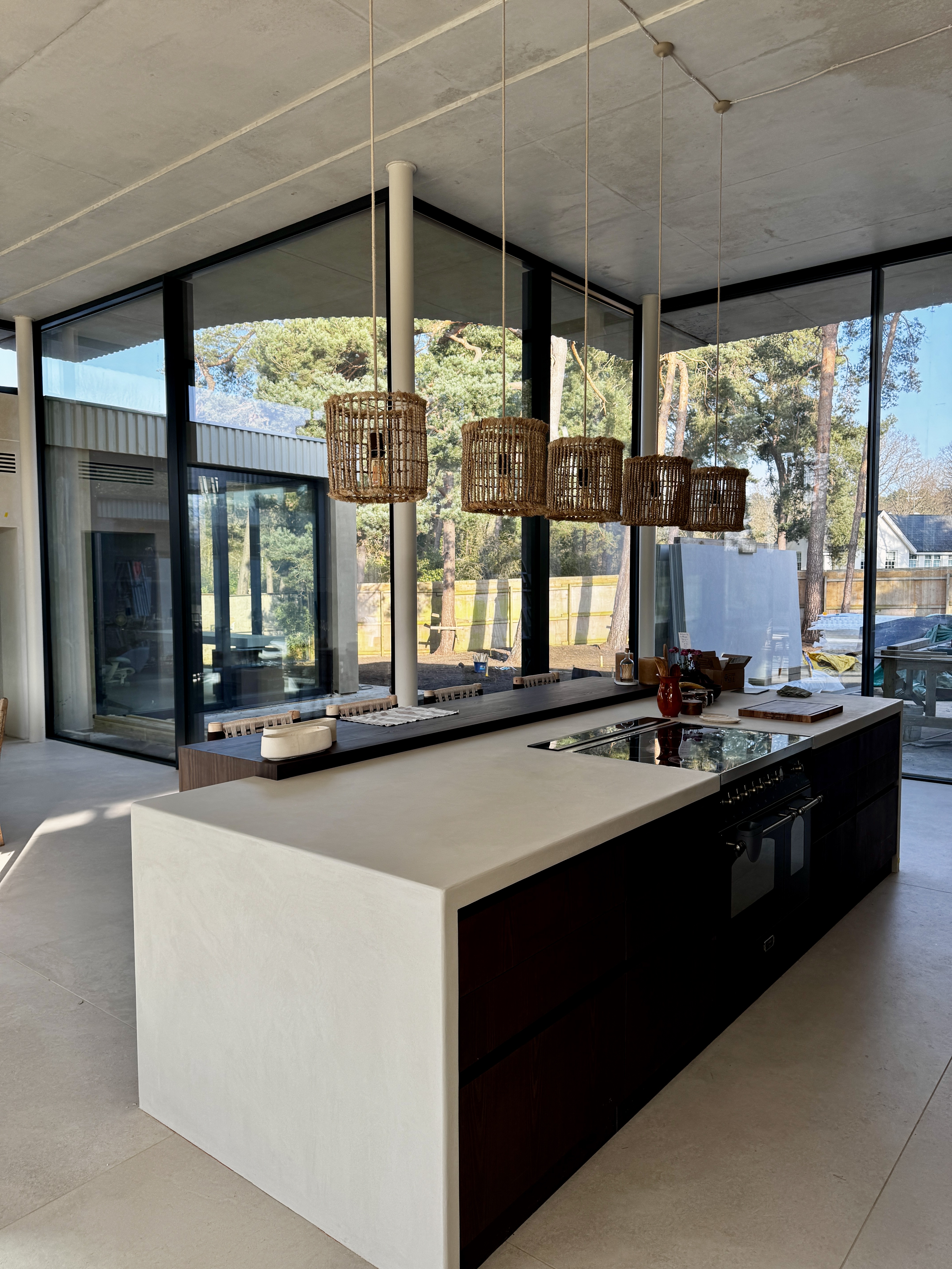 This open-plan kitchen design incorporates Microcement on the worktops and splashbacks for a seamless, durable surface. Its clean lines and matte texture add a minimalist touch to this natural-light-filled space.