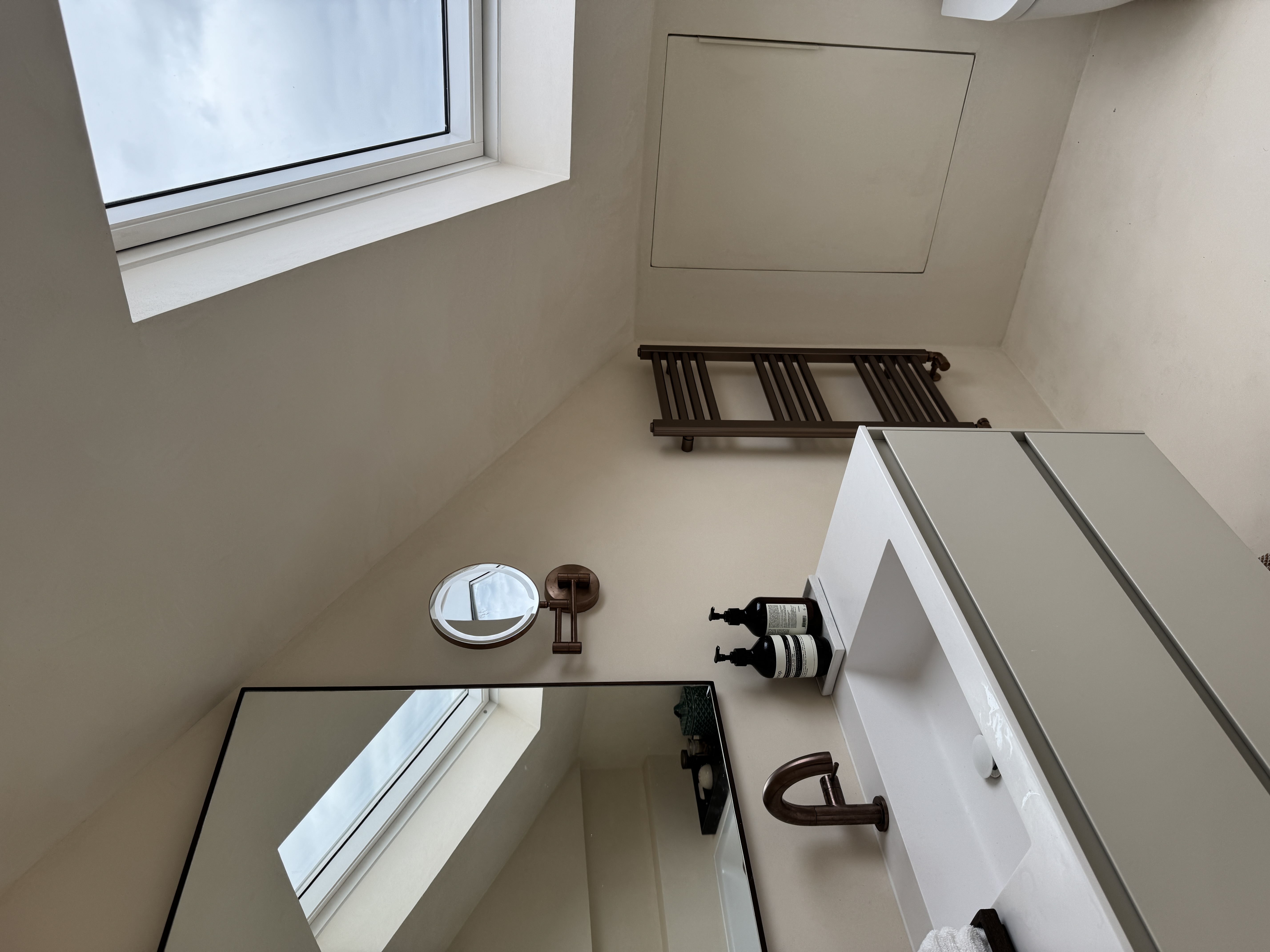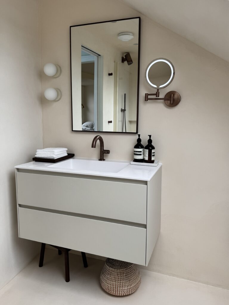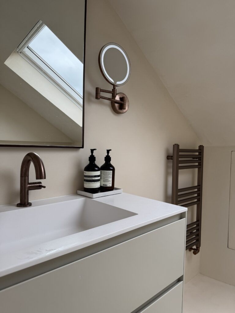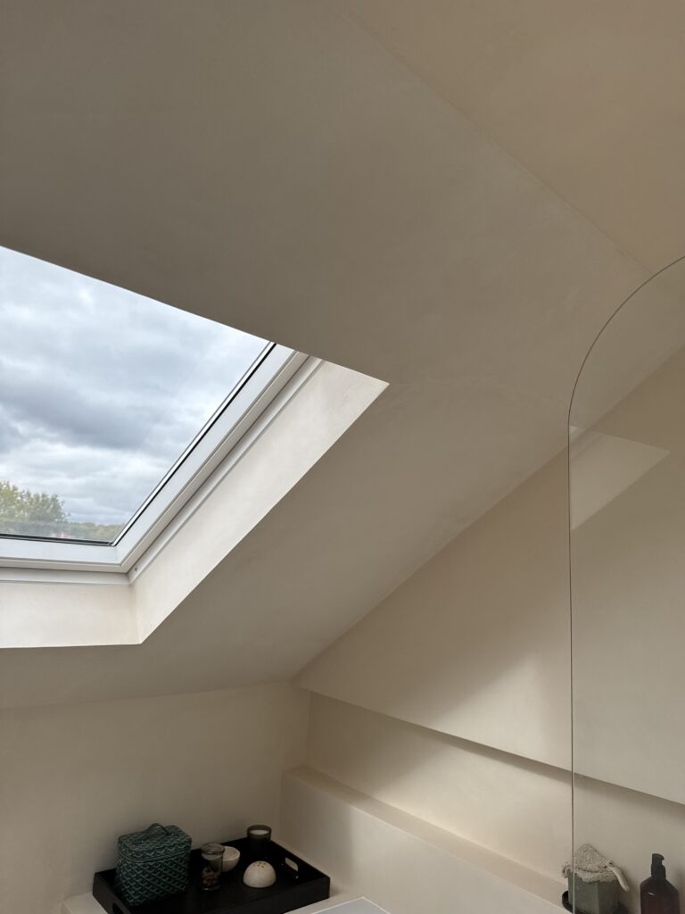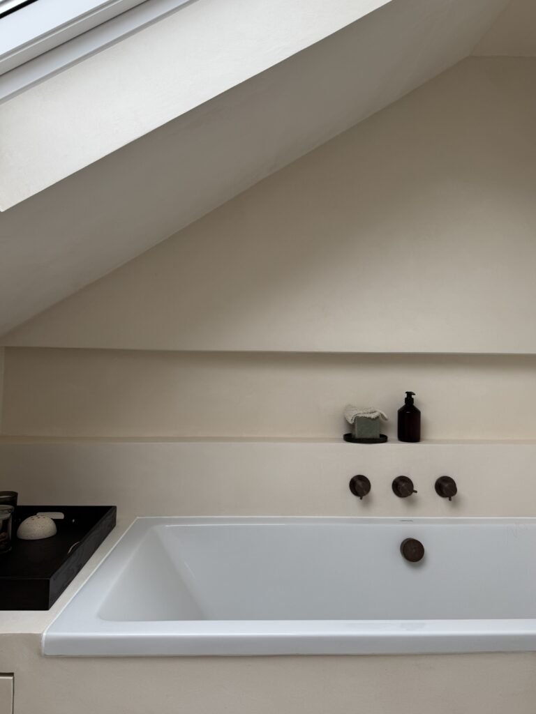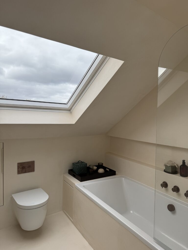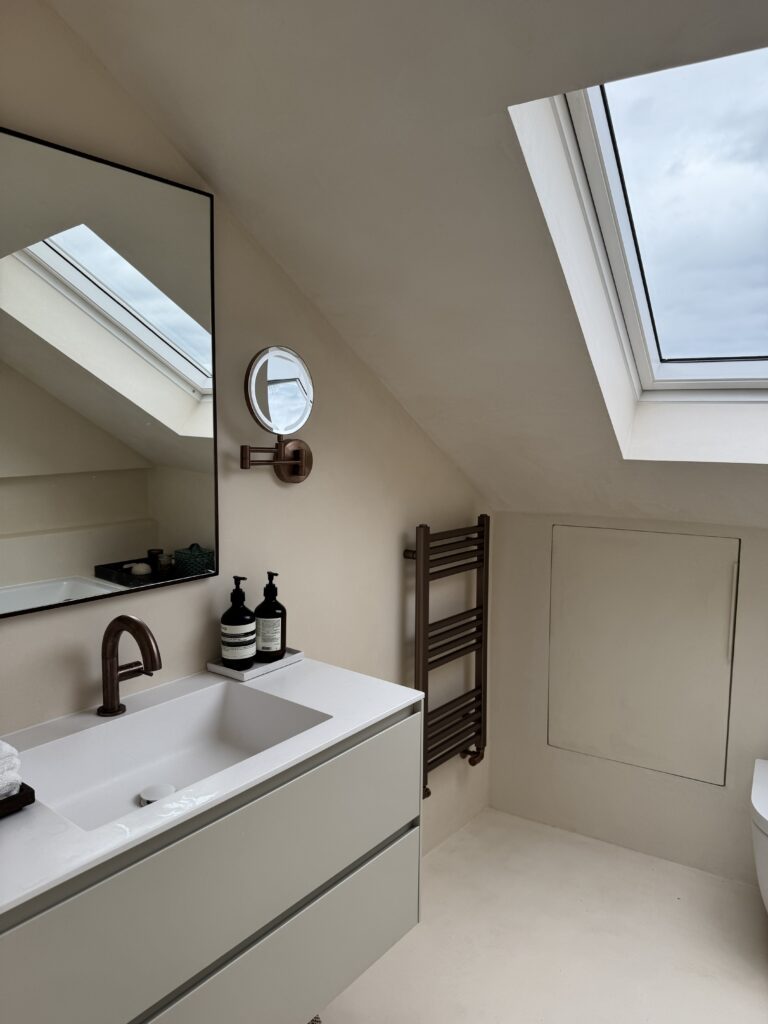 Set beneath sloped ceilings, this loft bathroom uses a soft-toned microcement finish to create a calm and cohesive space. The seamless surface flows across walls, bath surround, and vanity area, enhancing the natural light from the skylight and emphasising the room’s architectural lines. Warm bronze fittings and minimalist cabinetry add contrast and elegance, while the smooth texture of the microcement provides both durability and a refined, tranquil atmosphere.