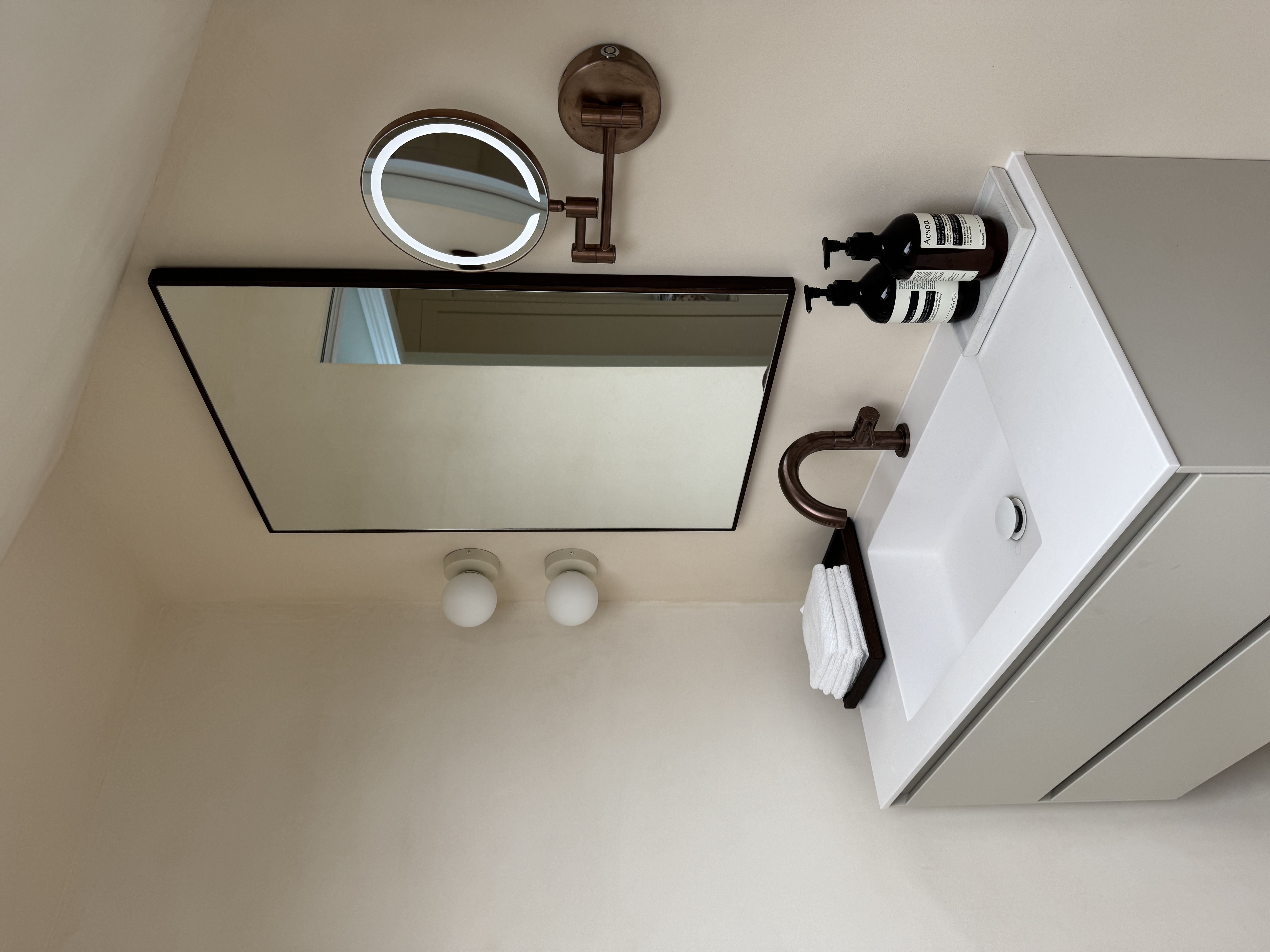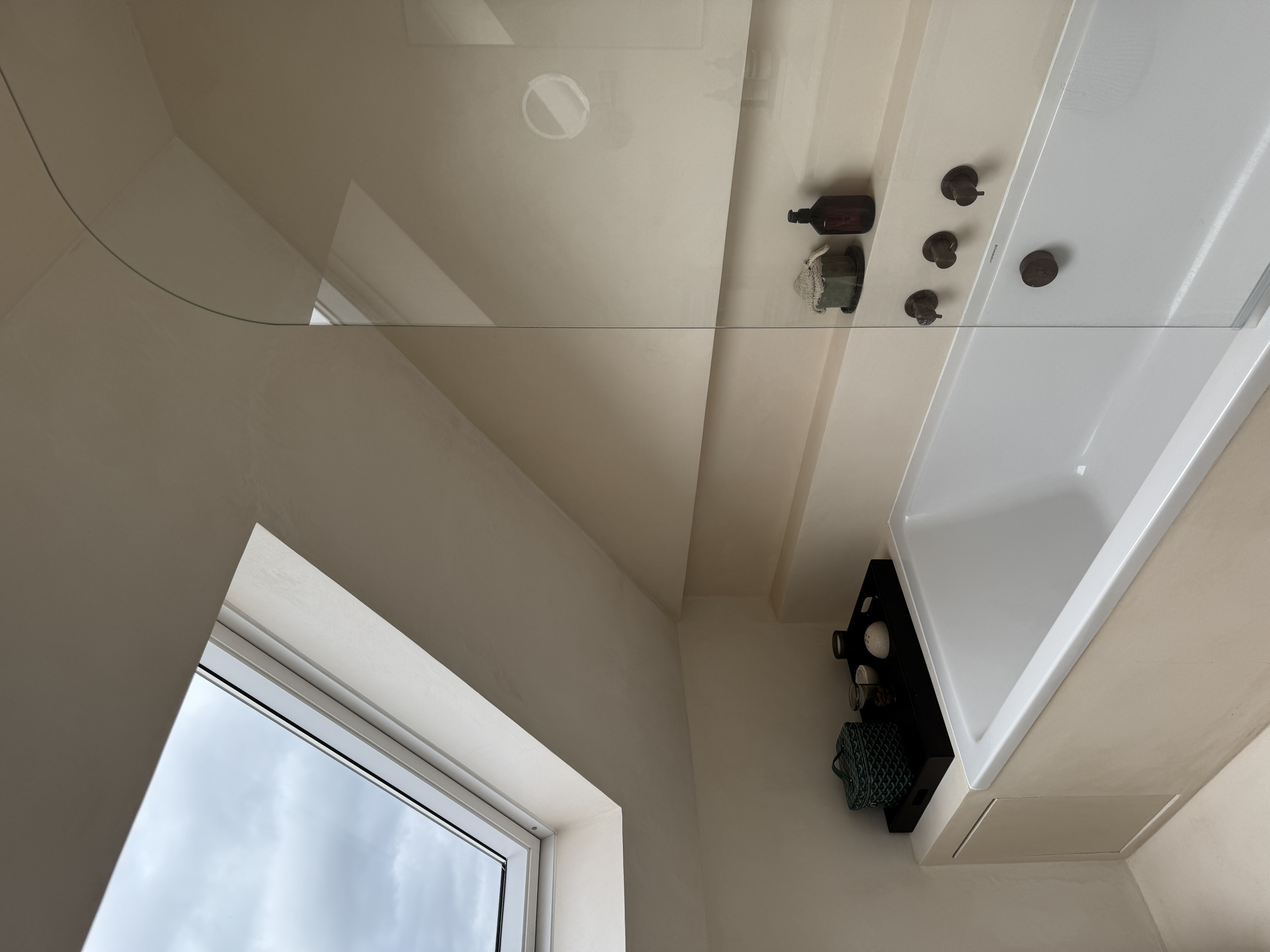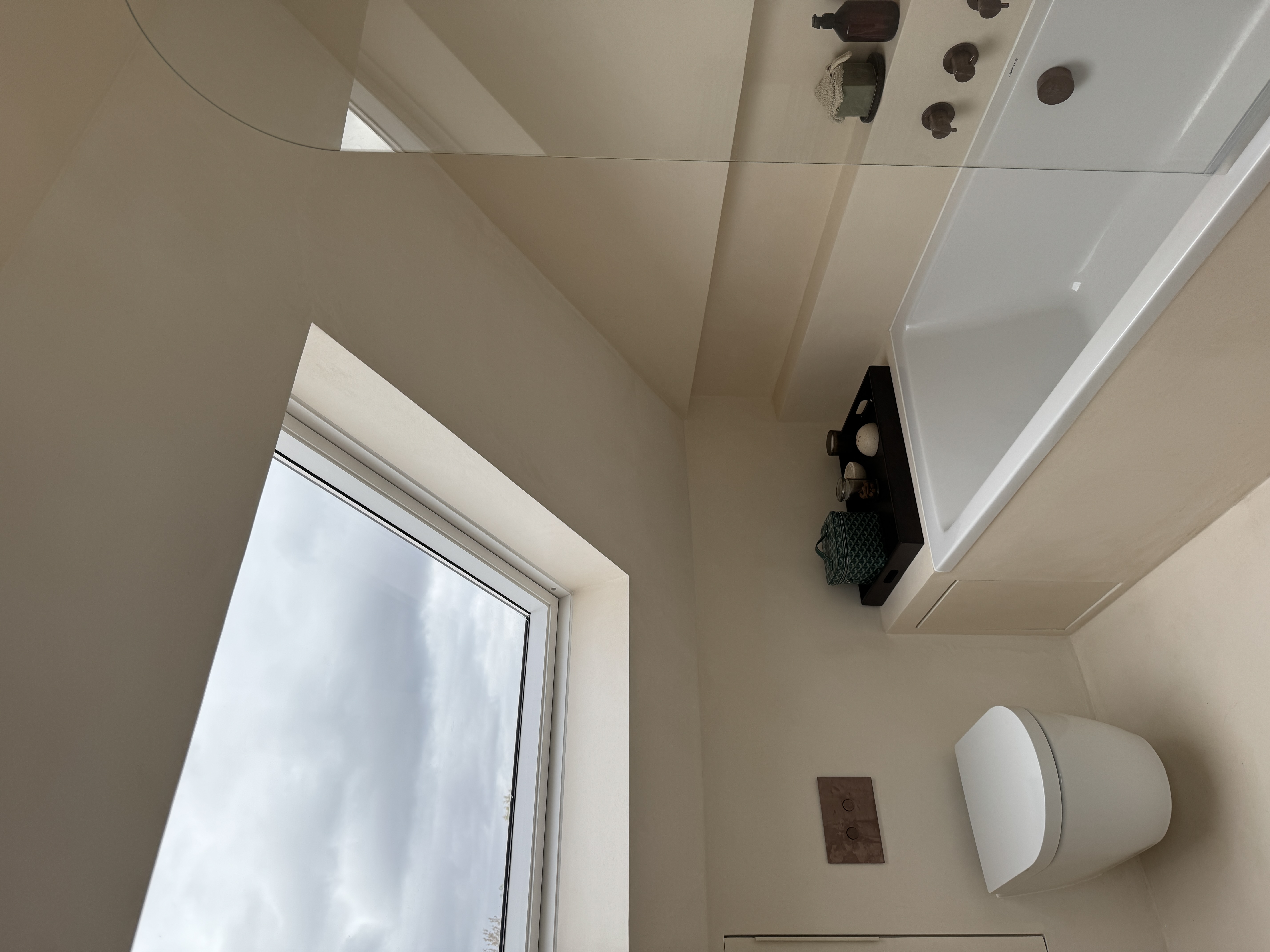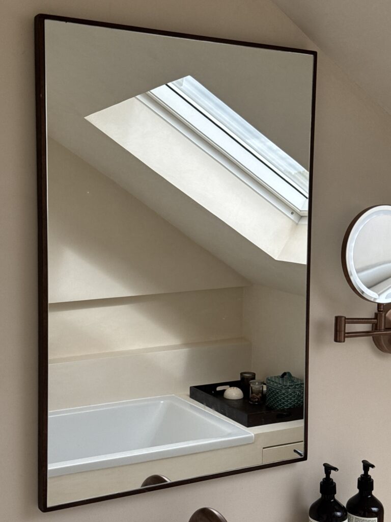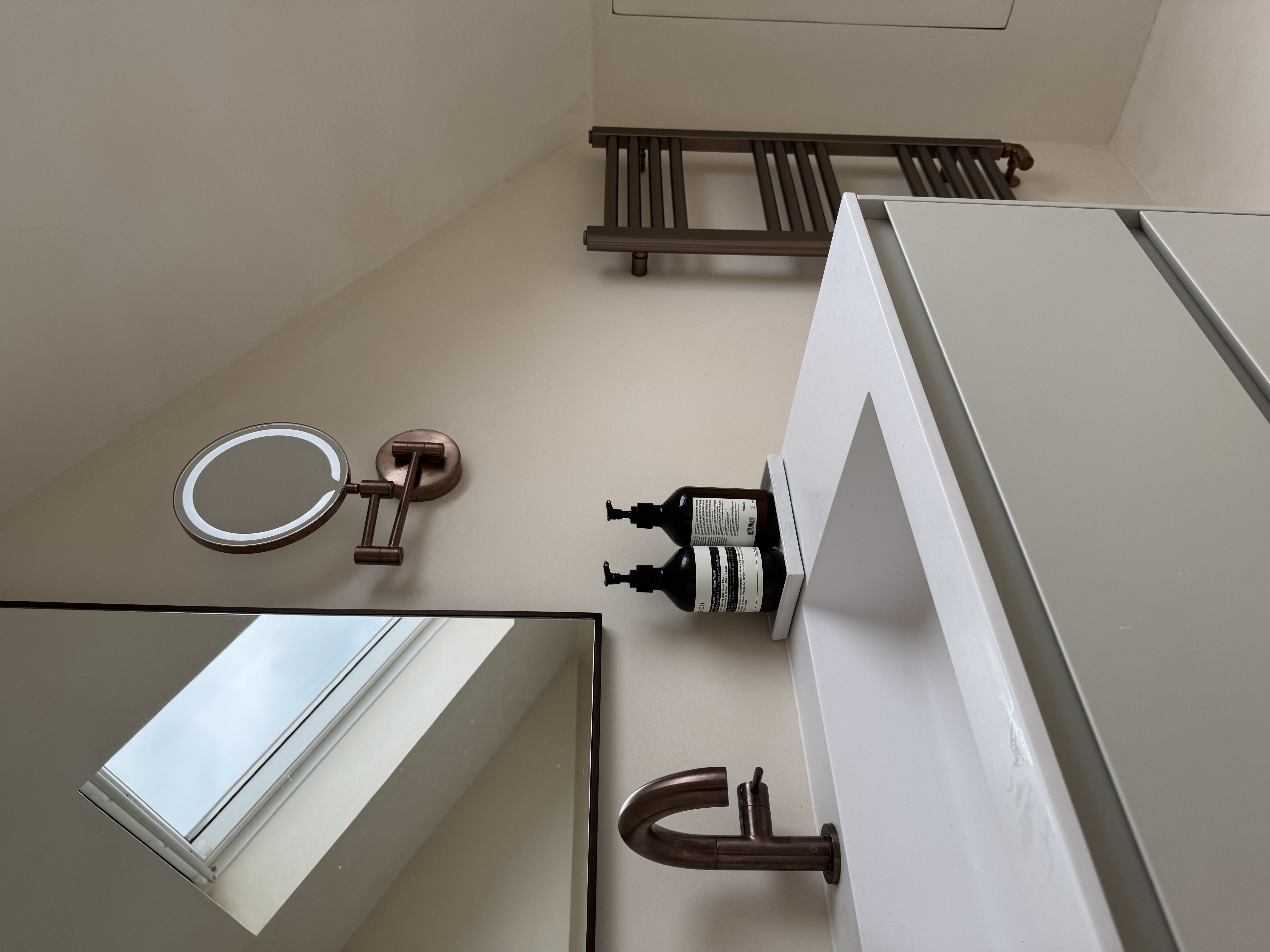 Set beneath sloped ceilings, this loft bathroom uses a soft-toned microcement finish to create a calm and cohesive space. The seamless surface flows across walls, bath surround, and vanity area, enhancing the natural light from the skylight and emphasising the room’s architectural lines. Warm bronze fittings and minimalist cabinetry add contrast and elegance, while the smooth texture of the microcement provides both durability and a refined, tranquil atmosphere.